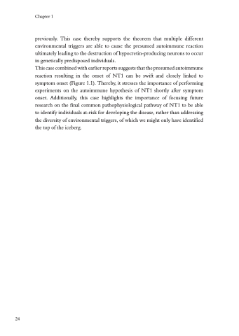 This case combined with earlier reports suggests that the presumed autoimmune reaction resulting in the onset of NT1 can be swift and closely linked to symptom onset (Figure 1.1). Thereby, it stresses the importance of performing experiments on the autoimmune hypothesis of NT1 shortly after symptom onset. Additionally, this case highlights the importance of focusing future research on the final common pathophysiological pathway of NT1 to be able to identify individuals at-risk for developing the disease, rather than addressing the diversity of environmental triggers, of which we might only have identified the top of the iceberg.