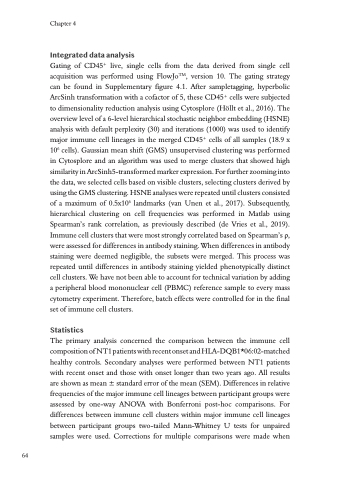Gating of CD45+ live, single cells from the data derived from single cell acquisition was performed using FlowJoTM, version 10. The gating strategy can be found in Supplementary figure 4.1. After sampletagging, hyperbolic ArcSinh transformation with a cofactor of 5, these CD45+ cells were subjected to dimensionality reduction analysis using Cytosplore (Höllt et al., 2016). The overview level of a 6-level hierarchical stochastic neighbor embedding (HSNE) analysis with default perplexity (30) and iterations (1000) was used to identify major immune cell lineages in the merged CD45+ cells of all samples (18.9 x 106 cells). Gaussian mean shift (GMS) unsupervised clustering was performed in Cytosplore and an algorithm was used to merge clusters that showed high similarity in ArcSinh5-transformed marker expression. For further zooming into the data, we selected cells based on visible clusters, selecting clusters derived by using the GMS clustering. HSNE analyses were repeated until clusters consisted of a maximum of 0.5x106 landmarks (van Unen et al., 2017). Subsequently, hierarchical clustering on cell frequencies was performed in Matlab using Spearman’s rank correlation, as previously described (de Vries et al., 2019). Immune cell clusters that were most strongly correlated based on Spearman’s ρ, were assessed for differences in antibody staining. When differences in antibody staining were deemed negligible, the subsets were merged. This process was repeated until differences in antibody staining yielded phenotypically distinct cell clusters. We have not been able to account for technical variation by adding a peripheral blood mononuclear cell (PBMC) reference sample to every mass cytometry experiment. Therefore, batch effects were controlled for in the final set of immune cell clusters.