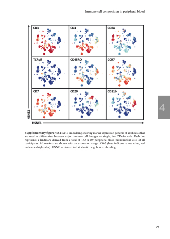 Supplementary figure 4.2. HSNE embedding showing marker expression patterns of antibodies that are used to differentiate between major immune cell lineages on single, live CD45+ cells. Each dot represents a landmark derived from a total of 18.8 x 106 peripheral blood mononuclear cells of all participants. All markers are shown with an expression range of 0-5 (blue indicates a low value, red indicates a high value). HSNE = hierarchical stochastic neighbour embedding.
