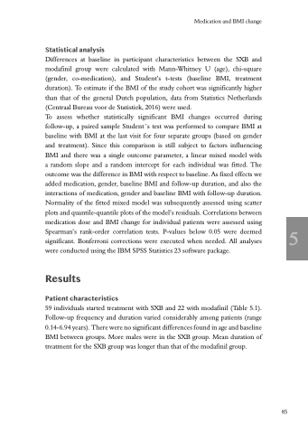 59 individuals started treatment with SXB and 22 with modafinil (Table 5.1). Follow-up frequency and duration varied considerably among patients (range 0.14-6.94 years). There were no significant differences found in age and baseline BMI between groups. More males were in the SXB group. Mean duration of treatment for the SXB group was longer than that of the modafinil group.