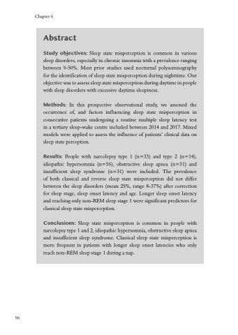 Conclusions: Sleep state misperception is common in people with narcolepsy type 1 and 2, idiopathic hypersomnia, obstructive sleep apnea and insufficient sleep syndrome. Classical sleep state misperception is more frequent in patients with longer sleep onset latencies who only reach non-REM sleep stage 1 during a nap.