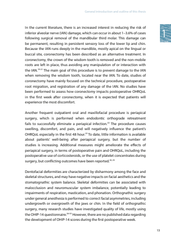 General introduction and outline of this thesis113In the current literature, there is an increased interest in reducing the risk of inferior alveolar nerve (IAN) damage, which can occur in about 1–3.6% of cases following surgical removal of the mandibular third molar. This damage can be permanent, resulting in persistent sensory loss of the lower lip and chin. Because the IAN runs deeply in the mandible, mostly apical on the lingual or buccal site, coronectomy has been described as an alternative treatment. In coronectomy, the crown of the wisdom tooth is removed and the non-mobile roots are left in place, thus avoiding any manipulation of or interaction with the IAN.19-21 The main goal of this procedure is to prevent damage to the IAN when removing the wisdom tooth, located near the IAN. To date, studies of coronectomy have mainly focused on the technical procedure, postoperative root migration, and registration of any damage of the IAN. No studies have been performed to assess how coronectomy impacts postoperative OHRQoL in the first week after coronectomy, when it is expected that patients will experience the most discomfort. Another frequent outpatient oral and maxillofacial procedure is periapical surgery, which is performed when endodontic orthograde retreatment fails to successfully eliminate a periapical infection.22 The procedure causes swelling, discomfort, and pain, and will negatively influence the patient’s OHRQoL especially in the first 48 hour.23 To date, little information is available about patients’ well-being after periapical surgery, but the number of studies is increasing. Additional measures might ameliorate the effects of periapical surgery, in terms of postoperative pain and OHRQoL, including the postoperative use of corticosteroids, or the use of platelet concentrates during surgery, but conflicting outcomes have been reported.24, 25Dentofacial deformities are characterized by disharmony among the face and skeletal structures, and may have negative impacts on facial aesthetics and the stomatognathic system balance. Skeletal deformities can be associated with malocclusion and neuromuscular system imbalance, potentially leading to impairments of respiration, mastication, and phonation. Orthognathic surgery under general anesthesia is performed to correct facial asymmetries, including undergrowth or overgrowth of the jaws or chin. In the field of orthognathic surgery, many research studies have investigated quality of life, mostly using the OHIP-14 questionnaire.26-33 However, there are no published data regarding the development of OHIP-14 scores during the first postoperative week.