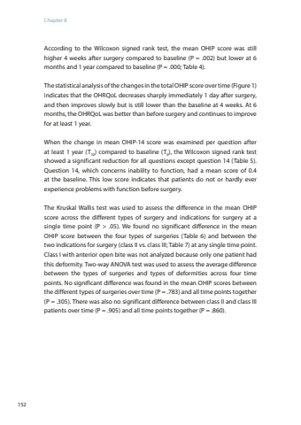 Chapter 8152According to the Wilcoxon signed rank test, the mean OHIP score was still higher 4 weeks after surgery compared to baseline (P = .002) but lower at 6 months and 1 year compared to baseline (P = .000; Table 4). The statistical analysis of the changes in the total OHIP score over time (Figure 1) indicates that the OHRQoL decreases sharply immediately 1 day after surgery, and then improves slowly but is still lower than the baseline at 4 weeks. At 6 months, the OHRQoL was better than before surgery and continues to improve for at least 1 year.When the change in mean OHIP-14 score was examined per question after at least 1 year (T10) compared to baseline (T0), the Wilcoxon signed rank test showed a significant reduction for all questions except question 14 (Table 5). Question 14, which concerns inability to function, had a mean score of 0.4 at the baseline. This low score indicates that patients do not or hardly ever experience problems with function before surgery. The Kruskal Wallis test was used to assess the difference in the mean OHIP score across the different types of surgery and indications for surgery at a single time point (P > .05). We found no significant difference in the mean OHIP score between the four types of surgeries (Table 6) and between the two indications for surgery (class II vs. class III; Table 7) at any single time point. Class I with anterior open bite was not analyzed because only one patient had this deformity. Two-way ANOVA test was used to assess the average difference between the types of surgeries and types of deformities across four time points. No significant difference was found in the mean OHIP scores between the different types of surgeries over time (P = .783) and all time points together (P = .305). There was also no significant difference between class II and class III patients over time (P = .905) and all time points together (P = .860).