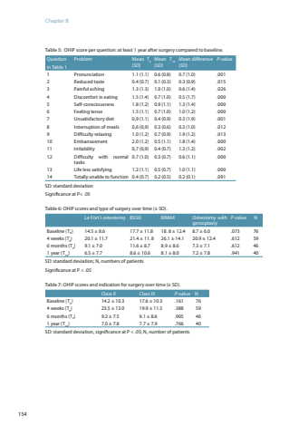Chapter 8154Table 5: OHIP score per question: at least 1 year after surgery compared to baseline. Question in Table 1Problem Mean T0(SD)Mean T10(SD)Mean difference (SD)P-value1 Pronunciation 1.1 (1.1) 0.6 (0.8) 0.7 (1.0) .0012 Reduced taste 0.4 (0.7) 0.1 (0.3) 0.3 (0.9) .0153 Painful aching 1.3 (1.3) 1.0 (1.0) 0.6 (1.4) .0264 Discomfort in eating 1.5 (1.4) 0.7 (1.0) 0.5 (1.7) .0005 Self-consciousness 1.8 (1.2) 0.9 (1.1) 1.3 (1.4) .0006 Feeling tense 1.5 (1.1) 0.7 (1.0) 1.0 (1.2) .0007 Unsatisfactory diet 0,9 (1.1) 0.4 (0.9) 0.3 (1.9) .0018 Interruption of meals 0,6 (0,9) 0.3 (0.6) 0.3 (1.0) .0129 Difficulty relaxing 1.0 (1.2) 0.7 (0.9) 1.9 (1.2) .01310 Embarrassment 2.0 (1.2) 0.5 (1.1) 1.8 (1.4) .00011 Irritability 0,7 (0,9) 0.4 (0.7) 1.3 (1.2) .00212 Difficulty with normal tasks0.7 (1.0) 0.3 (0.7) 0.6 (1.1) .00013 Life less satisfying 1.2 (1.1) 0.5 (0.7) 1.0 (1.1) .00014 Totally unable to function 0.4 (0.7) 0.2 (0.5) 0.2 (0.1) .091SD: standard deviationSignificance at P< .05 Table 6: OHIP scores and type of surgery over time (± SD).Le Fort I osteotomy BSSO BIMAX Osteotomy with genioplastyP-value N Baseline (T0) 14.5 ± 8.6 17.7 ± 11.8 18. 8 ± 12.4 8.7 ± 6.0 .073 764 weeks (T8) 20.1 ± 11.7 21.4 ± 11. 8 26.1 ± 14.1 20.9 ± 12.4 .612 596 months (T9) 9.1 ± 7.0 11.6 ± 8.7 8.9 ± 8.6 7.3 ± 7.1 .612 461 year (T10) 6.5 ± 7.7 8.6 ± 10.6 8.1 ± 8.0 7.2 ± 7.8 .941 40SD: standard deviation; N, numbers of patientsSignificance at P < .05Table 7: OHIP scores and indication for surgery over time (± SD).Class II Class III P-value NBaseline (T0) 14.2 ± 10.3 17.6 ± 10.3 .161 764 weeks (T8) 23.5 ± 13.0 19.9 ± 11.5 .388 596 months (T9) 9.2 ± 7.5 9.1 ± 8.6 .905 461 year (T10) 7.0 ± 7.8 7.7 ± 7.9 .766 40SD: standard deviation, significance at P < .05; N, number of patients