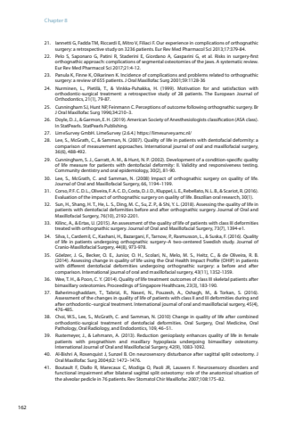 Chapter 816221. Iannetti G, Fadda TM, Riccardi E, Mitro V, Filiaci F. Our experience in complications of orthognathic surgery: a retrospective study on 3236 patients. Eur Rev Med Pharmacol Sci 2013;17:379-84.22. Pelo S, Saponaro G, Patini R, Staderini E, Giordano A, Gasparini G, et al. Risks in surgery-first orthognathic approach: complications of segmental osteotomies of the jaws. A systematic review. Eur Rev Med Pharmacol Sci 2017;21:4-12.23. Panula K, Finne K, Oikarinen K. Incidence of complications and problems related to orthognathic surgery: a review of 655 patients. J Oral Maxillofac Surg 2001;59:1128-3624. Nurminen, L., Pietilä, T., & Vinkka-Puhakka, H. (1999). Motivation for and satisfaction with orthodontic-surgical treatment: a retrospective study of 28 patients. The European Journal of Orthodontics, 21(1), 79-87.25. Cunningham SJ, Hunt NP, Feinmann C. Perceptions of outcome following orthognathic surgery. Br J Oral Maxillofac Surg 1996;34:210–3.26. Doyle, D. J., & Garmon, E. H. (2019). American Society of Anesthesiologists classification (ASA class). In StatPearls. StatPearls Publishing.27. LimeSurvey GmbH. LimeSurvey (2.6.4.) https://limesurvey.amc.nl/28. Lee, S., McGrath, C., & Samman, N. (2007). Quality of life in patients with dentofacial deformity: a comparison of measurement approaches. International journal of oral and maxillofacial surgery, 36(6), 488-492.29. Cunningham, S. J., Garratt, A. M., & Hunt, N. P. (2002). Development of a condition‐specific quality of life measure for patients with dentofacial deformity: II. Validity and responsiveness testing. Community dentistry and oral epidemiology, 30(2), 81-90.30. Lee, S., McGrath, C. and Samman, N. (2008) Impact of orthognathic surgery on quality of life. Journal of Oral and Maxillofacial Surgery, 66, 1194–1199.31. Corso, P. F. C. D. L., Oliveira, F. A. C. D., Costa, D. J. D., Kluppel, L. E., Rebellato, N. L. B., & Scariot, R. (2016). Evaluation of the impact of orthognathic surgery on quality of life. Brazilian oral research, 30(1).32. Sun, H., Shang, H. T., He, L. S., Ding, M. C., Su, Z. P., & Shi, Y. L. (2018). Assessing the quality of life in patients with dentofacial deformities before and after orthognathic surgery. Journal of Oral and Maxillofacial Surgery, 76(10), 2192-2201.33. Kilinc, A., & Ertas, U. (2015). An assessment of the quality of life of patients with class III deformities treated with orthognathic surgery. Journal of Oral and Maxillofacial Surgery, 73(7), 1394-e1.34. Silva, I., Cardemil, C., Kashani, H., Bazargani, F., Tarnow, P., Rasmusson, L., & Suska, F. (2016). Quality of life in patients undergoing orthognathic surgery–A two-centered Swedish study. Journal of Cranio-Maxillofacial Surgery, 44(8), 973-978.35. Göelzer, J. G., Becker, O. E., Junior, O. H., Scolari, N., Melo, M. S., Heitz, C., & de Oliveira, R. B. (2014). Assessing change in quality of life using the Oral Health Impact Profile (OHIP) in patients with different dentofacial deformities undergoing orthognathic surgery: a before and after comparison. International journal of oral and maxillofacial surgery, 43(11), 1352-1359.36. Wee, T. H., & Poon, C. Y. (2014). Quality of life treatment outcomes of class III skeletal patients after bimaxillary osteotomies. Proceedings of Singapore Healthcare, 23(3), 183-190.37. Baherimoghaddam, T., Tabrizi, R., Naseri, N., Pouzesh, A., Oshagh, M., & Torkan, S. (2016). Assessment of the changes in quality of life of patients with class II and III deformities during and after orthodontic–surgical treatment. International journal of oral and maxillofacial surgery, 45(4), 476-485.38. Choi, W.S., Lee, S., McGrath, C. and Samman, N. (2010) Change in quality of life after combined orthodontic-surgical treatment of dentofacial deformities. Oral Surgery, Oral Medicine, Oral Pathology, Oral Radiology, and Endodontics, 109, 46–51.39. Rustemeyer, J., & Lehmann, A. (2013). Reduction genioplasty enhances quality of life in female patients with prognathism and maxillary hypoplasia undergoing bimaxillary osteotomy. International Journal of Oral and Maxillofacial Surgery, 42(9), 1083-1092.40. Al-Bishri A, Rosenquist J, Sunzel B. On neurosensory disturbance after sagittal split osteotomy. J Oral Maxillofac Surg 2004;62: 1472–1476.41. Boutault F, Diallo R, Marecaux C, Modiga O, Paoli JR, Lauwers F. Neurosensory disorders and functional impairment after bilateral sagittal split osteotomy: role of the anatomical situation of the alveolar pedicle in 76 patients. Rev Stomatol Chir Maxillofac 2007;108:175–82.
