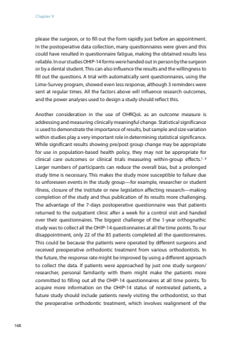 Chapter 9168please the surgeon, or to fill out the form rapidly just before an appointment. In the postoperative data collection, many questionnaires were given and this could have resulted in questionnaire fatigue, making the obtained results less reliable. In our studies OHIP-14 forms were handed out in person by the surgeon or by a dental student. This can also influence the results and the willingness to fill out the questions. A trial with automatically sent questionnaires, using the Lime-Survey program, showed even less response, although 3 reminders were sent at regular times. All the factors above will influence research outcomes, and the power analyses used to design a study should reflect this.Another consideration in the use of OHRQoL as an outcome measure is addressing and measuring clinically meaningful change. Statistical significance is used to demonstrate the importance of results, but sample and size variation within studies play a very important role in determining statistical significance. While significant results showing pre/post group change may be appropriate for use in population-based health policy, they may not be appropriate for clinical care outcomes or clinical trials measuring within-group effects.7, 8Larger numbers of participants can reduce the overall bias, but a prolonged study time is necessary. This makes the study more susceptible to failure due to unforeseen events in the study group—for example, researcher or student illness, closure of the institute or new legislation affecting research—making completion of the study and thus publication of its results more challenging. The advantage of the 7-days postoperative questionnaire was that patients returned to the outpatient clinic after a week for a control visit and handed over their questionnaires. The biggest challenge of the 1-year orthognathic study was to collect all the OHIP-14 questionnaires at all the time points. To our disappointment, only 22 of the 85 patients completed all the questionnaires. This could be because the patients were operated by different surgeons and received preoperative orthodontic treatment from various orthodontists. In the future, the response rate might be improved by using a different approach to collect the data. If patients were approached by just one study surgeon/researcher, personal familiarity with them might make the patients more committed to filling out all the OHIP-14 questionnaires at all time points. To acquire more information on the OHIP-14 status of nontreated patients, a future study should include patients newly visiting the orthodontist, so that the preoperative orthodontic treatment, which involves realignment of the
