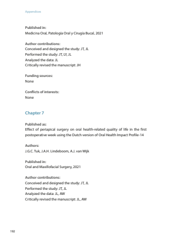 Appendices192Published in:Medicina Oral, Patología Oral y Cirugía Bucal, 2021Author contributions:Conceived and designed the study: JT, JLPerformed the study: JT, LY, JLAnalyzed the data: JLCritically revised the manuscript: JH Funding sources:NoneConflicts of interests:NoneChapter 7Published as:Effect of periapical surgery on oral health-related quality of life in the first postoperative week using the Dutch version of Oral Health Impact Profile-14Authors:J.G.C. Tuk, J.A.H. Lindeboom, A.J. van WijkPublished in:Oral and Maxillofacial Surgery, 2021Author contributions:Conceived and designed the study: JT, JLPerformed the study: JT, JLAnalyzed the data: JL, AWCritically revised the manuscript: JL, AW