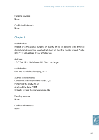 193AContributing authors of the manuscript in this thesisFunding sources:NoneConflicts of interests:NoneChapter 8Published as:Impact of orthognathic surgery on quality of life in patients with different dentofacial deformities: longitudinal study of the Oral Health Impact Profile (OHIP-14) with at least 1 year of follow-upAuthors:J.G.C. Tuk, J.A.H. Lindeboom, M.L. Tan, J. de LangePublished in:Oral and Maxillofacial Surgery, 2022Author contributions:Conceived and designed the study: JT, JLPerformed the study: JT, MTAnalyzed the data: JT, MTCritically revised the manuscript: JL, JdLFunding sources:NoneConflicts of interests:None