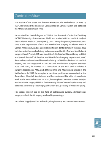 201ACurriculum VitaeThe author of this thesis was born in Hilversum, The Netherlands on May 22, 1974. He finished the Christelijk College Stad en Lande, Huizen and obtained his Atheneum diploma in 1992. He received his dental degree in 1998 at the Academic Center for Dentistry (ACTA)/ University of Amsterdam (UvA), and started with his medical study at the Academic Medical Centre (AMC), UvA. During this period, he worked parttime at the department of Oral and Maxillofacial surgery, Academic Medical Center, Amsterdam, and as a dentist in different dental clinics. In the year 2000 he interrupted his medical study to become a resident in Oral and Maxillofacial surgery (head: Prof. dr. H.P. van den Akker). He finished his residency in 2004, and joined the staff of the Oral and Maxillofacial surgery department, AMC, Amsterdam, and continued his medical study. In 2005 he obtained his medical degree, and was registered as an Oral and Maxillofacial surgeon. Between 2005 and 2007, he worked as a consultant at the Oral and Maxillofacial surgery department, AMC, and different Oral and Maxillofacial clinics in the Netherlands. In 2007, he accepted a part-time position as a consultant at the Amstelland Hospital, Amstelveen and he combines this with his academic work at the Amsterdam UMC. In 2017, he completed a master course (MSc) in aesthetic facial surgery EFMZ at the University Witten/ Herdecke, Germany, and obtained a University Teaching Qualification (BKO), Faculty of Medicine (UvA). His special interest are in the field of orthognatic surgery, dentoalveolar surgery, esthetic facial surgery, and oral implantology. Jacco lives happily with his wife Yulia, daughter Lisa, and son Misha in Huizen.