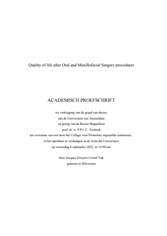 Quality of life after Oral and Maxillofacial Surgery proceduresACADEMISCH PROEFSCHRIFTter verkrijging van de graad van doctoraan de Universiteit van Amsterdamop gezag van de Rector Magnificusprof. dr. ir. P.P.C.C. Verbeekten overstaan van een door het College voor Promoties ingestelde commissie, in het openbaar te verdedigen in de Aula der Universiteitop woensdag 6 september 2023, te 14.00 uurdoor Jacques Gooyert Cornel Tukgeboren te Hilversum