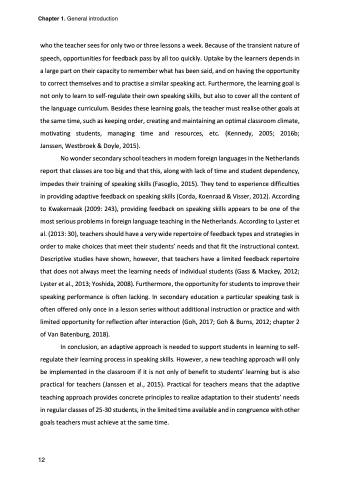 who the teacher sees for only two or three lessons a week. Because of the transient nature of speech, opportunities for feedback pass by all too quickly. Uptake by the learners depends in a large part on their capacity to remember what has been said, and on having the opportunity to correct themselves and to practise a similar speaking act. Furthermore, the learning goal is not only to learn to self-regulate their own speaking skills, but also to cover all the content of the language curriculum. Besides these learning goals, the teacher must realise other goals at the same time, such as keeping order, creating and maintaining an optimal classroom climate, motivating students, managing time and resources, etc. (Kennedy, 2005; 2016b; Janssen, Westbroek & Doyle, 2015).