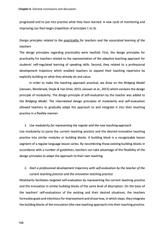 The design principles regarding practicality were twofold. First, the design principles for practicality for teachers related to the representation of the adaptive teaching approach for students’ self-regulated learning of speaking skills. Second, they related to a professional development trajectory which enabled teachers to expand their teaching repertoire by explicitly building on what they already do and value.