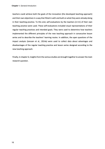 teachers could achieve both the goals of the innovation (the developed teaching approach) and their own objectives in a way that fitted in with and built on what they were already doing in their teaching practice. To this end, self-evaluations by the teachers (n=11) of their own teaching practice were used. These self-evaluations included visual representations of their regular teaching practices and intended goals. They were used to determine how teachers implemented the different principles of the new teaching approach in consecutive lesson series and to describe the teachers’ learning routes. In addition, the open questions of the impact analysis (Janssen et al., 2014a) were used to collect data about advantages and disadvantages of the regular teaching practice and lesson series designed according to the new teaching approach.