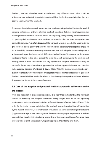 To sum up: descriptive research has shown that teachers mainly give feedback at the level of speaking performance and have a limited feedback repertoire that does not always meet the learning needs of individual students. That is not surprising, since providing adaptive feedback on speaking skills in classes of 25-30 students (as is usual in the Dutch secondary education context) is complex. First of all, because of the transient nature of speech, the opportunity to give feedback passes quickly and how the student picks it up (the uptake) depends largely on his or her ability to remember exactly what was said, and on having the chance to improve it and practise it again. Furthermore, it is difficult to give feedback to 30 students, partly because the teacher has to realise other aims at the same time, such as motivating the students and keeping order in class. This means that any approach to adaptive feedback will only be successful if it not only aids the learning process, but is also an approach that teachers consider to be practical (Janssen, Westbroek & Doyle, 2015). With this in mind we designed a self- evaluation procedure for students and investigated whether this helped teachers to gear their feedback to the individual needs of students as they develop their speaking skills and whether it was practical for use in the regular classroom.
