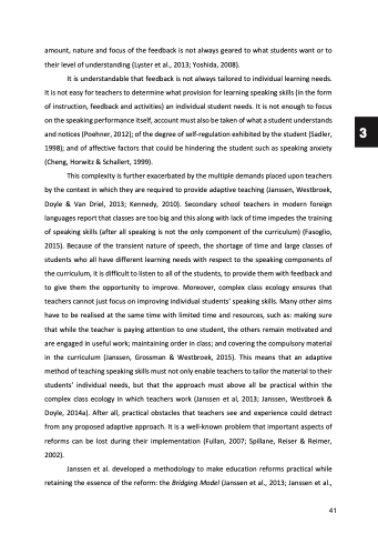 It is understandable that feedback is not always tailored to individual learning needs. It is not easy for teachers to determine what provision for learning speaking skills (in the form of instruction, feedback and activities) an individual student needs. It is not enough to focus on the speaking performance itself, account must also be taken of what a student understands and notices (Poehner, 2012); of the degree of self-regulation exhibited by the student (Sadler, 1998); and of affective factors that could be hindering the student such as speaking anxiety (Cheng, Horwitz & Schallert, 1999).