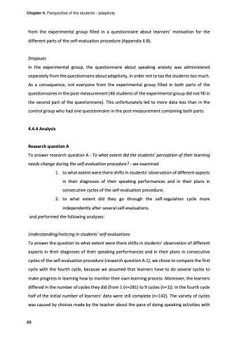 In the experimental group, the questionnaire about speaking anxiety was administered separately from the questionnaire about adaptivity, in order not to tax the students too much. As a consequence, not everyone from the experimental group filled in both parts of the questionnaires in the post-measurement (46 students of the experimental group did not fill in the second part of the questionnaire). This unfortunately led to more data loss than in the control group who had one questionnaire in the post-measurement containing both parts.