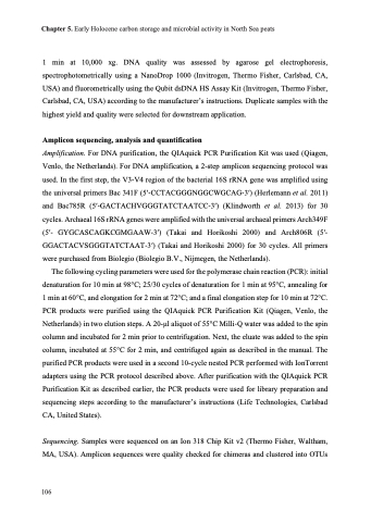 Amplification. For DNA purification, the QIAquick PCR Purification Kit was used (Qiagen, Venlo, the Netherlands). For DNA amplification, a 2-step amplicon sequencing protocol was used. In the first step, the V3-V4 region of the bacterial 16S rRNA gene was amplified using the universal primers Bac 341F (5′-CCTACGGGNGGCWGCAG-3′) (Herlemann et al. 2011) and Bac785R (5′-GACTACHVGGGTATCTAATCC-3′) (Klindworth et al. 2013) for 30 cycles. Archaeal 16S rRNA genes were amplified with the universal archaeal primers Arch349F (5′- GYGCASCAGKCGMGAAW-3′) (Takai and Horikoshi 2000) and Arch806R (5′- GGACTACVSGGGTATCTAAT-3′) (Takai and Horikoshi 2000) for 30 cycles. All primers were purchased from Biolegio (Biolegio B.V., Nijmegen, the Netherlands).