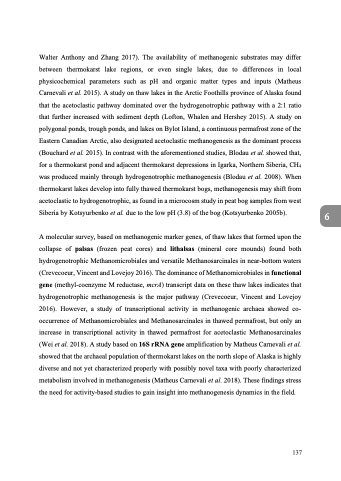 A molecular survey, based on methanogenic marker genes, of thaw lakes that formed upon the collapse of palsas (frozen peat cores) and lithalsas (mineral core mounds) found both hydrogenotrophic Methanomicrobiales and versatile Methanosarcinales in near-bottom waters (Crevecoeur, Vincent and Lovejoy 2016). The dominance of Methanomicrobiales in functional gene (methyl-coenzyme M reductase, mcrA) transcript data on these thaw lakes indicates that hydrogenotrophic methanogenesis is the major pathway (Crevecoeur, Vincent and Lovejoy 2016). However, a study of transcriptional activity in methanogenic archaea showed co- occurrence of Methanomicrobiales and Methanosarcinales in thawed permafrost, but only an increase in transcriptional activity in thawed permafrost for acetoclastic Methanosarcinales (Wei et al. 2018). A study based on 16S rRNA gene amplification by Matheus Carnevali et al. showed that the archaeal population of thermokarst lakes on the north slope of Alaska is highly diverse and not yet characterized properly with possibly novel taxa with poorly characterized metabolism involved in methanogenesis (Matheus Carnevali et al. 2018). These findings stress the need for activity-based studies to gain insight into methanogenesis dynamics in the field.