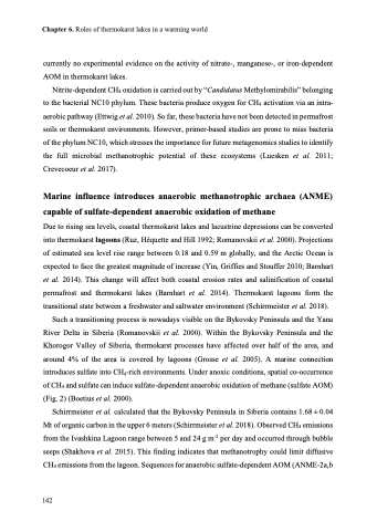Nitrite-dependent CH4 oxidation is carried out by “Candidatus Methylomirabilis” belonging to the bacterial NC10 phylum. These bacteria produce oxygen for CH4 activation via an intra- aerobic pathway (Ettwig et al. 2010). So far, these bacteria have not been detected in permafrost soils or thermokarst environments. However, primer-based studies are prone to miss bacteria of the phylum NC10, which stresses the importance for future metagenomics studies to identify the full microbial methanotrophic potential of these ecosystems (Luesken et al. 2011; Crevecoeur et al. 2017).