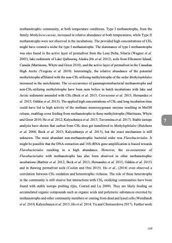 methanotrophic community, at both temperature conditions. Type I methanotrophs, from the family Methylococcaceae, increased in relative abundance at both temperatures, while Type II methanotrophs were not observed in the incubations. The provided high concentrations of CH4 might have created a niche for type I methanotrophs. The dominance of type I methanotrophs was also found in the active layer of permafrost from the Lena Delta, Siberia (Wagner et al. 2005), lake sediments of Lake Qalluuraq, Alaska (He et al. 2012), soils from Ellesmere Island, Canada (Martineau, Whyte and Greer 2010), and the active layer of permafrost in the Canadian High Arctic (Yergeau et al. 2010). Interestingly, the relative abundance of the potential methylotrophs affiliated with the non-CH4 utilizing methylotrophs of the order Methylophilales increased in the enrichments. The co-occurrence of gammaproteobacterial methanotrophs and non-CH4-utilizing methylotrophs have been seen before in batch incubations with lake and Arctic sediments amended with CH4 (Beck et al. 2013; Crevecoeur et al. 2015; Hernandez et al. 2015; Oshkin et al. 2015). The applied high concentrations of CH4 and long incubation time could have led to high activity of the methane monooxygenase enzyme resulting in MeOH release, enabling cross feeding from methanotrophs to these methylotrophs (Martineau, Whyte and Greer 2010; He et al. 2012; Kalyuzhnaya et al. 2013; Tavormina et al. 2017). Stable isotope analysis have shown that carbon from CH4 does get transferred to Methylophilales (Hutchens et al. 2004; Beck et al. 2013; Kalyuzhnaya et al. 2013), but the exact mechanism is still unknown. The most abundant non-methanotrophic bacterial order was Flavobacteriales. It might be possible that the DNA extraction and 16S rRNA gene amplification is biased towards Flavobacteriales resulting in a high abundance. However, the co-occurrence of Flavobacteriales with methanotrophs has also been observed in other methanotrophic incubations (Barbier et al. 2012; Beck et al. 2013; Hernandez et al. 2015; Oshkin et al. 2015) and in thawing permafrost soils (Coolen and Orsi 2015). Ho et al., (2014) even observed a correlation between CH4 oxidation and heterotrophic richness. The role of these heterotrophs in the community is still elusive but interactions with CH4 oxidizing communities have been found with stable isotope probing (Qiu, Conrad and Lu 2009). They are likely feeding on accumulated organic compounds such as organic acids and polymeric substances excreted by methanotrophs and other community members or coming from dead and lysed cells (Wendlandt et al. 2010; Kalyuzhnaya et al. 2013; Ho et al. 2014; Yu and Chistoserdova 2017). Further work