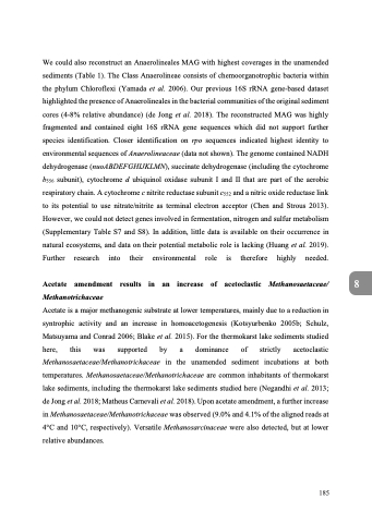 We could also reconstruct an Anaerolineales MAG with highest coverages in the unamended sediments (Table 1). The Class Anaerolineae consists of chemoorganotrophic bacteria within the phylum Chloroflexi (Yamada et al. 2006). Our previous 16S rRNA gene-based dataset highlighted the presence of Anaerolineales in the bacterial communities of the original sediment cores (4-8% relative abundance) (de Jong et al. 2018). The reconstructed MAG was highly fragmented and contained eight 16S rRNA gene sequences which did not support further species identification. Closer identification on rpo sequences indicated highest identity to environmental sequences of Anaerolineaceae (data not shown). The genome contained NADH dehydrogenase (nuoABDEFGHIJKLMN), succinate dehydrogenase (including the cytochrome b556 subunit), cytochrome d ubiquinol oxidase subunit I and II that are part of the aerobic respiratory chain. A cytochrome c nitrite reductase subunit c552 and a nitric oxide reductase link to its potential to use nitrate/nitrite as terminal electron acceptor (Chen and Strous 2013). However, we could not detect genes involved in fermentation, nitrogen and sulfur metabolism (Supplementary Table S7 and S8). In addition, little data is available on their occurrence in natural ecosystems, and data on their potential metabolic role is lacking (Huang et al. 2019). Further research into their environmental role is therefore highly needed.