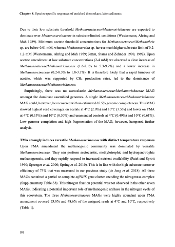 TMA strongly induces versatile Methanosarcinaceae with distinct temperature responses Upon TMA amendment the methanogenic community was dominated by versatile Methanosarcinaceae. They can perform acetoclastic, methylotrophic and hydrogenotrophic methanogenesis, and they rapidly respond to increased nutrient availability (Patel and Sprott 1990; Sprenger et al. 2000; Spring et al. 2010). This is in line with the high substrate turnover efficiency of 73% that was measured in our previous study (de Jong et al. 2018). All three MAGs contained a partial or complete nifDHK gene cluster encoding the nitrogenase complex (Supplementary Table S8). This nitrogen fixation potential was not observed in the other seven MAGs, indicating a potential important role of methanogenic archaea in the nitrogen cycle of this ecosystem. The three Methanosarcinaceae MAGs were highly abundant upon TMA amendment covered 53.0% and 48.6% of the assigned reads at 4°C and 10°C, respectively (Table 1).