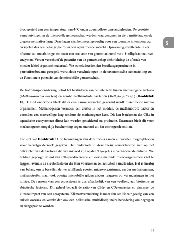 blootgesteld aan een temperatuur van 4°C onder zuurstofloze omstandigheden. De grootste verschuivingen in de microbiële gemeenschap werden waargenomen in de transitielaag en de diepere permafrostlaag. Deze lagen zijn het meest gevoelig voor een toename in temperatuur en spelen dus een belangrijke rol in een opwarmende wereld. Opwarming resulteerde in een afname van metabole genen, maar een toename van genen coderend voor koolhydraat-actieve enzymen. Verder verschoof de potentie van de gemeenschap zich richting de afbraak van minder labiel organisch materiaal. We concludeerden dat broeikasgasproductie in permafrostbodems geregeld wordt door verschuivingen in de taxonomische samenstelling en de functionele potentie van de microbiële gemeenschap.