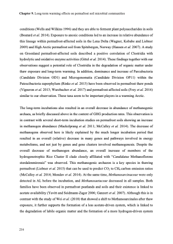 conditions (Wells and Wilkins 1996) and they are able to ferment plant polysaccharides in soils (Boutard et al. 2014). Exposure to anoxic conditions led to an increase in relative abundance of this lineage within permafrost-affected soils in the Lena Delta (Wagner, Kobabe and Liebner 2009) and High Arctic permafrost soil from Spitsbergen, Norway (Hansen et al. 2007). A study on Greenland permafrost-affected soils described a positive correlation of Clostridia with hydrolytic and oxidative enzyme activities (Gittel et al. 2014). These findings together with our observations suggest a potential role of Clostridia in the degradation of organic matter under thaw exposure and long-term warming. In addition, dominance and increase of Parcubacteria (Candidate Division OD1) and Microgenomatia (Candidate Division OP11) within the Patescibacteria superphylum (Rinke et al. 2013) have been observed in permafrost thaw ponds (Vigneron et al. 2013; Wurzbacher et al. 2017) and permafrost-affected soils (Frey et al. 2016) similar to our observation. These taxa seem to be important players in a warming Arctic.