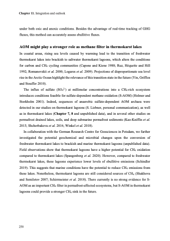 In collaboration with the German Research Centre for Geosciences in Potsdam, we further investigated the potential geochemical and microbial changes upon the conversion of freshwater thermokarst lakes to brackish and marine thermokarst lagoons (unpublished data). Field observations show that thermokarst lagoons have a higher potential for CH4 oxidation compared to thermokarst lakes (Spangenberg et al. 2020). However, compared to freshwater thermokarst lakes, these lagoons experience lower levels of ebullitive emissions (Schindler 2019). This suggests that marine conditions have the potential to reduce CH4 emissions from these lakes. Nonetheless, thermokarst lagoons are still considered sources of CH4 (Shakhova and Semiletov 2007; Schirrmeister et al. 2018). There currently is no strong evidence for S- AOM as an important CH4 filter in permafrost-affected ecosystems, but S-AOM in thermokarst lagoons could provide a stronger CH4 sink in the future.