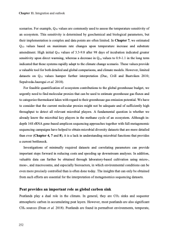 scenarios. For example, Q10 values are commonly used to assess the temperature sensitivity of an ecosystem. This sensitivity is determined by geochemical and biological parameters, but their implementation is complex and data points are often limited. In Chapter 7, we estimated Q10 values based on maximum rate changes upon temperature increase and substrate amendment. High initial Q10 values of 3.3-9.8 after 98 days of incubation indicated greater sensitivity upon direct warming, whereas a decrease in Q10 values to 0.9-1.1 in the long term indicated that these systems rapidly adapt to the climate change scenario. These values provide a valuable tool for both detailed and global comparisons, and climate models. However, limited datasets on Q10 values hamper further interpretation (Duc, Crill and Bastviken 2010; Sepulveda-Jauregui et al. 2018).