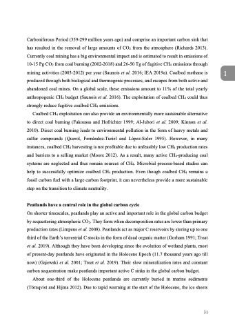 Carboniferous Period (359-299 million years ago) and comprise an important carbon sink that has resulted in the removal of large amounts of CO2 from the atmosphere (Richards 2013). Currently coal mining has a big environmental impact and is estimated to result in emissions of 10-15 Pg CO2 from coal burning (2002-2018) and 26-50 Tg of fugitive CH4 emissions through mining activities (2003-2012) per year (Saunois et al. 2016; IEA 2019a). Coalbed methane is produced through both biological and thermogenic processes, and escapes from both active and abandoned coal mines. On a global scale, these emissions amount to 11% of the total yearly anthropogenic CH4 budget (Saunois et al. 2016). The exploitation of coalbed CH4 could thus strongly reduce fugitive coalbed CH4 emissions.