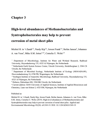 Michiel H. in ‘t Zandt, Nardy Kip, Jeroen Frank, Stefan Jansen, Johannes A. van Veen, Mike S.M. Jetten, Cornelia U. Welte (2019). High-level abundances of Methanobacteriales and Syntrophobacterales may help to prevent corrosion of metal sheet piles. Applied and Environmental Microbiology 85(20): e01369-19. DOI: 10.1128/AEM.01369-19