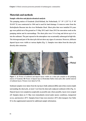 The pumping station of Gouderak (Zuid-Holland, the Netherlands, 51° 59' 1.233" N, 4° 40' 20.654" E) was constructed in 1866 and is used for land drainage. It removes water from the Stolwijksche Boezem into the river Hollandse IJssel. Sheet piles that were installed 50 years ago were pulled out of the ground on 31 May 2012 and 6 June 2012 for renovation work on the pumping station and its surroundings. The sheet piles were 5-6 m long and driven up to 4 m into the sediment. The part exposed to the atmosphere was occasionally submerged at high tide. The belowground part of the sheet pile did not show any signs of corrosion. However, different deposit layers were visible at various depths (Fig. 1). Samples were taken from the sheet pile directly after extraction.