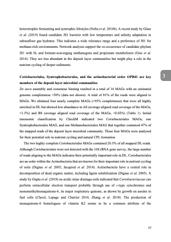 heterotrophic fermenting and syntrophic lifestyles (Nobu et al. 2016b). A recent study by Glass et al. (2019) found candidate JS1 bacteria with low temperature and salinity adaptation in subseafloor gas hydrates. This indicates a wide tolerance range and a preference of JS1 for methane-rich environments. Network analyses support the co-occurrence of candidate phylum JS1 with H2 and formate-scavenging methanogens and propionate metabolizers (Gies et al. 2014). They are less abundant in the deposit layer communities but might play a role in the nutrient cycling of deeper sediments.