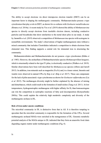 The ability to accept electrons via direct interspecies electron transfer (DIET) can be an important factor in shaping the methanogenic community. Methanosarcinales possess c-type cytochromes that play a role in DIET, as shown for co-cultures with Geobacter metallireducens (Rotaru et al. 2014a). A recent study by Yee et al. (2019) showed the ability of Methanosarcina species to directly accept electrons from insoluble electron donors, including conductive particles and biocathodes that show similarities to the metal sheet piles in our study. A study by Jaramillo et al. (2019) observed a competition of Methanosarcina species with acetogens in nonsulfidic environments. The study’s observations of higher methanogenesis rates without a mixed community that includes Clostridiales indicated a competition to obtain electrons from elemental iron. This finding supports a central role for elemental iron in structuring the community.